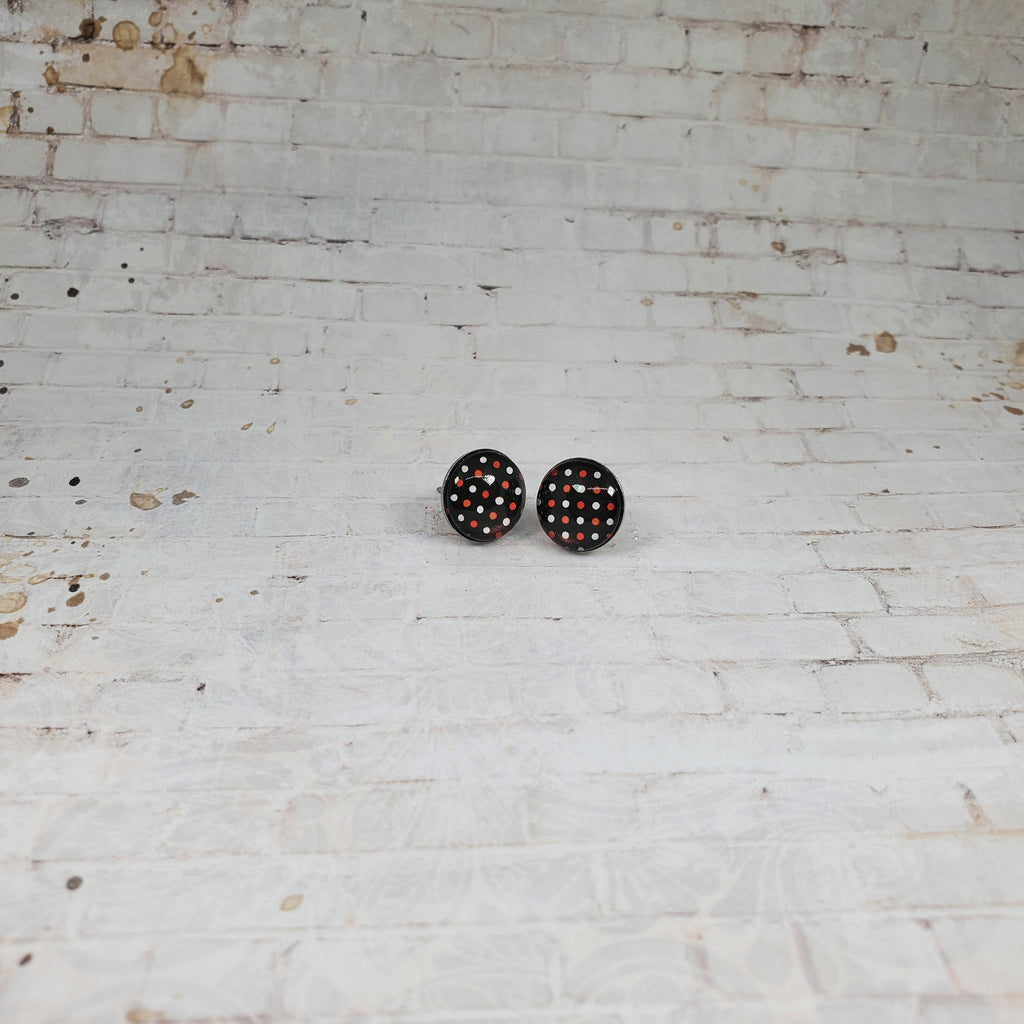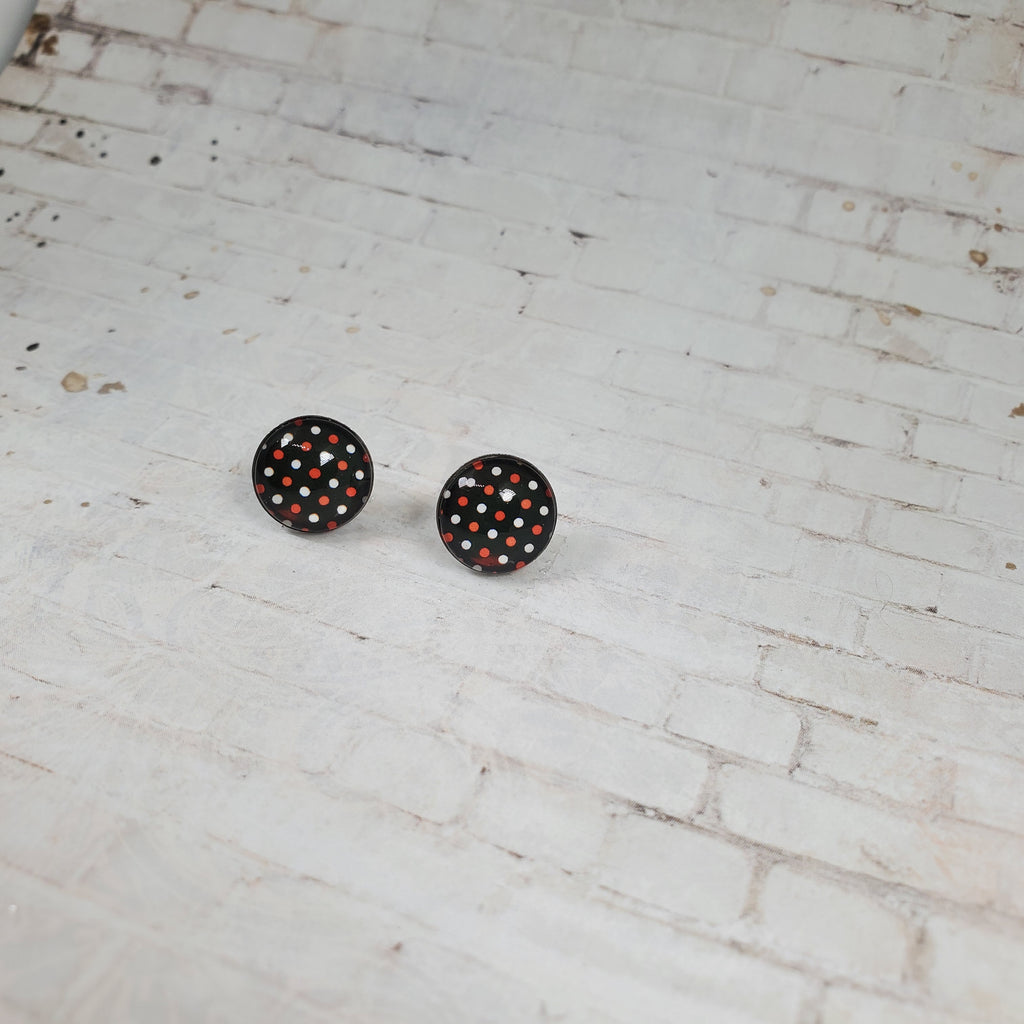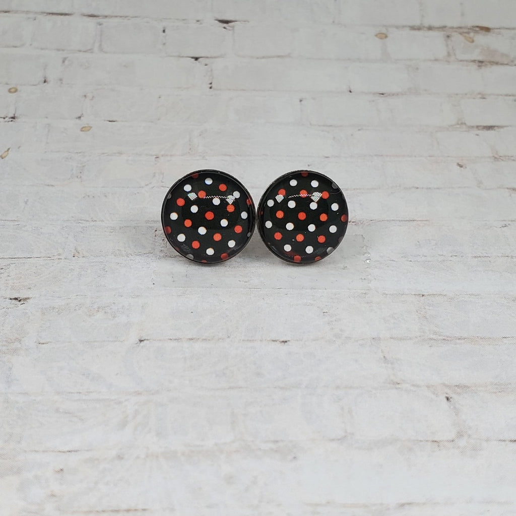 Halloween Earrings, 12MM Studs, Polka Dot Earrings, Polka Dot Studs, Fall Earrings, Halloween Studs, Halloween Jewelry, Black with Polka Dot
