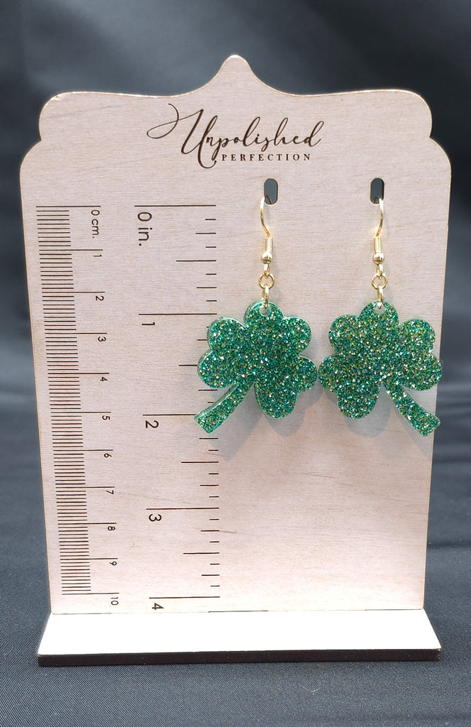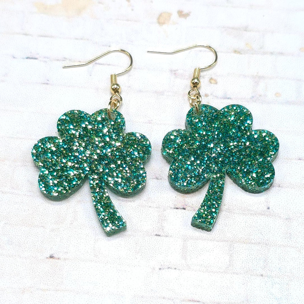 St Patricks Day Earrings, Glitter Acrylic, 3-Leaf Clover Earrings, Clover Earrings, Shamrock Earrings, Irish Jewelry, Lucky Earrings